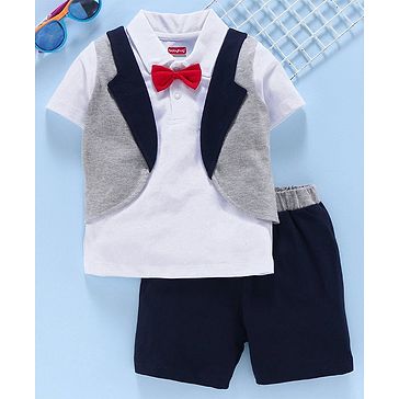 Babyhug Half Sleeves Tee With Mock Waist Coat & Shorts - White Navy Blue