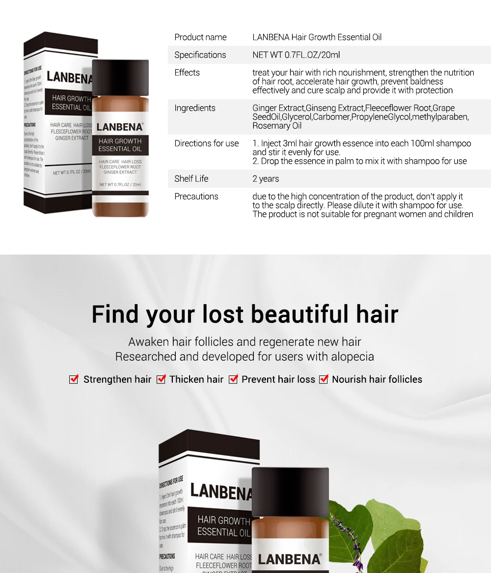 LANBENA Faster Grow Hair Health Care Dense Hair Growth Essential Oil Products Fleeceflower Root Extract Hair Growth 20ML
