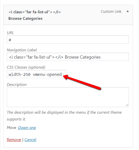 if you don’t have css Classes field, click on top right corner “Screen options” and enable css class field there